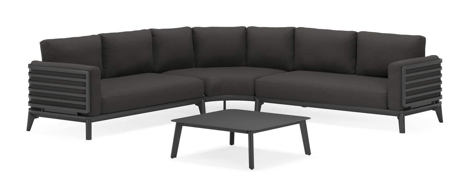 De Mosa loungehoek in zwart aluminium met natte sooty all weather sunbrella® premium kussens en loungetafel is van het merk Bristol Essentials en is hier verkrijgbaar in de kleur zwart.