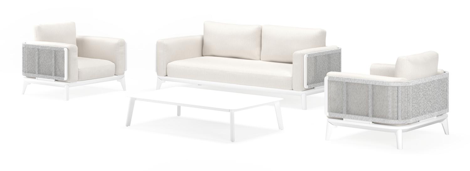 De Mosa loungeset in wit aluminium en wit-grijs gedraaide ronde wicker met sand weather+ softtouch kussens en loungetafel is van het merk Bristol Essentials en is hier verkrijgbaar in de kleur wit/beige/wit-grijs.