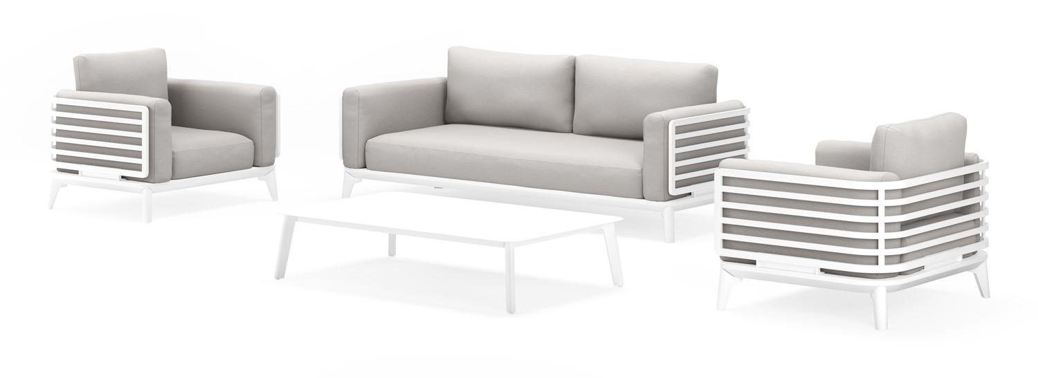 De Mosa loungeset in wit aluminium met natte graumel chalk all weather sunbrella® premium kussens en loungetafel is van het merk Bristol Essentials en is hier verkrijgbaar in de kleur beige/wit.