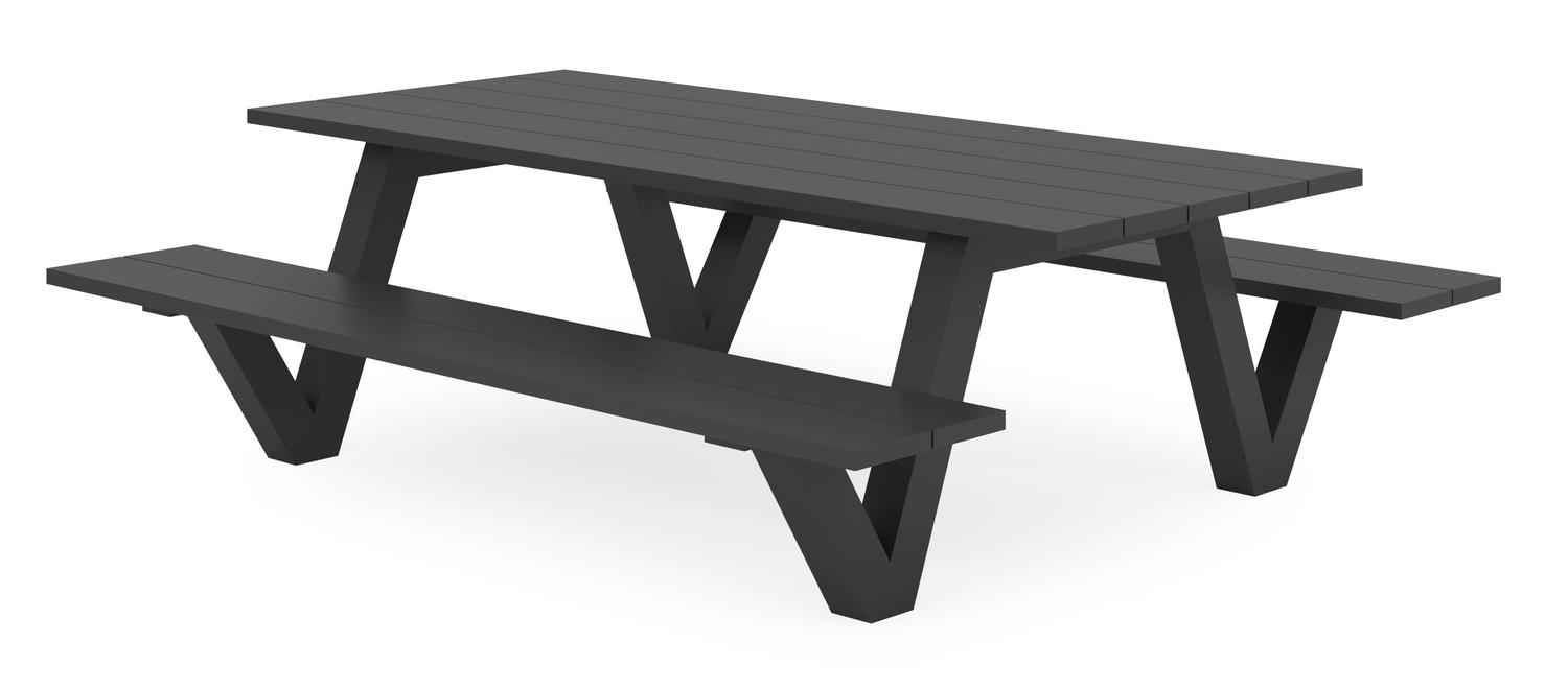 De Norma picknicktafel straalt een eigentijdse en afgelijnde look uit. De tafel is herkenbaar aan zijn gestroomlijnde v-poot onder het frame.