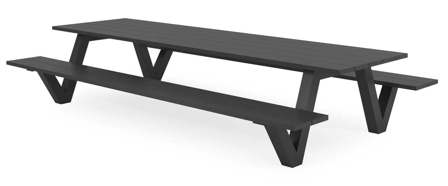 De Norma picknicktafel straalt een eigentijdse en afgelijnde look uit. De tafel is herkenbaar aan zijn gestroomlijnde v-poot onder het frame.