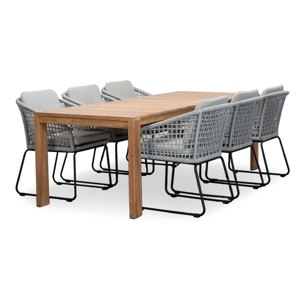 De Oakland/Tulum grijs dining tuinset 7-delig | teakhout + touw | 240cm is een schitterende tuinset geschikt voor 6 personen. De tuinset komt uit de collectie van BUITEN living.
