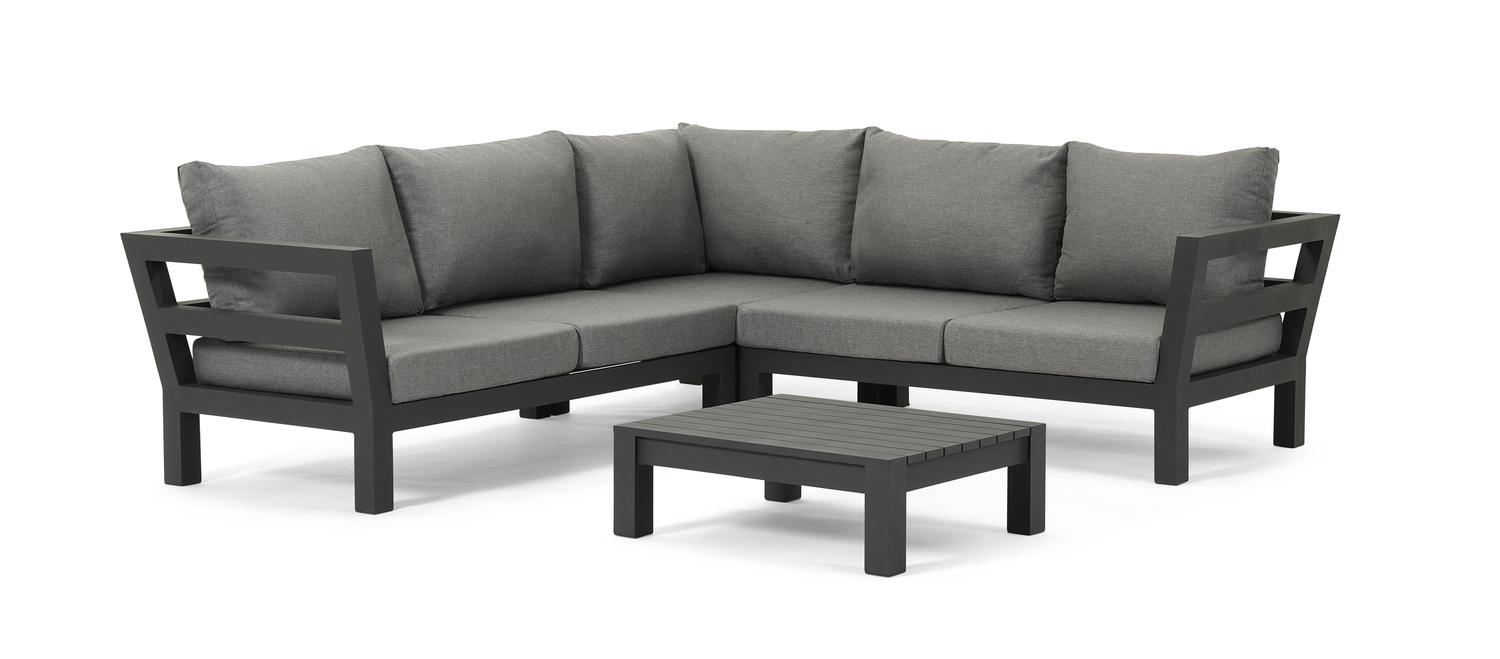 De Occaro loungeset in zwart aluminium met grijs weather+ softtouch en loungetafel is van het merk Bristol Essentials en is hier verkrijgbaar in de kleur zwart/grijs.