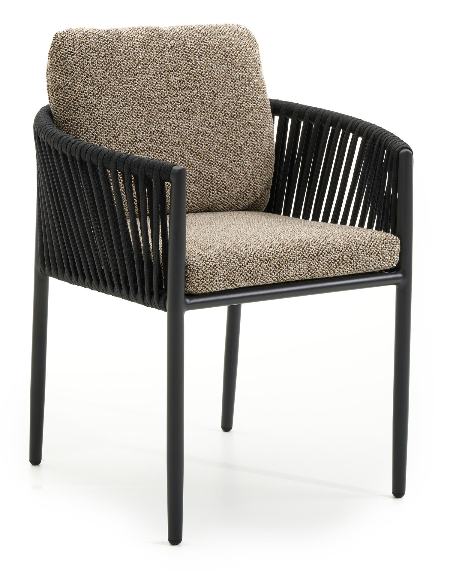 Organo tuinstoel in zwart aluminium en zwart verticaal geweven luxe vlakke rope met kussen in madagascar burch all weather cosytica