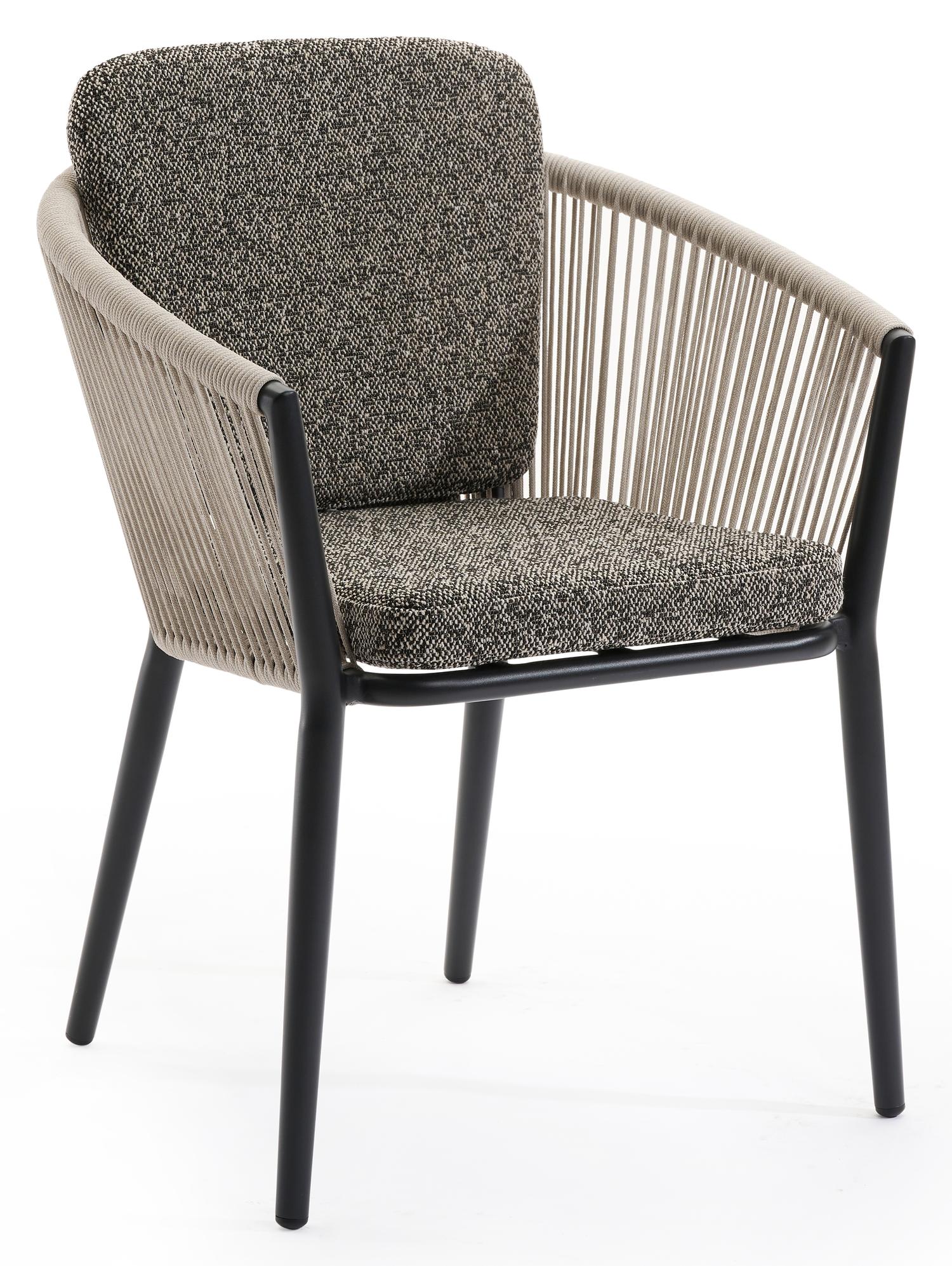 Productomschrijving Orso tuinstoel in zwart aluminium en beige verticaal geweven vlakke rope met kussen in marbella tunder All Weather Cosytica