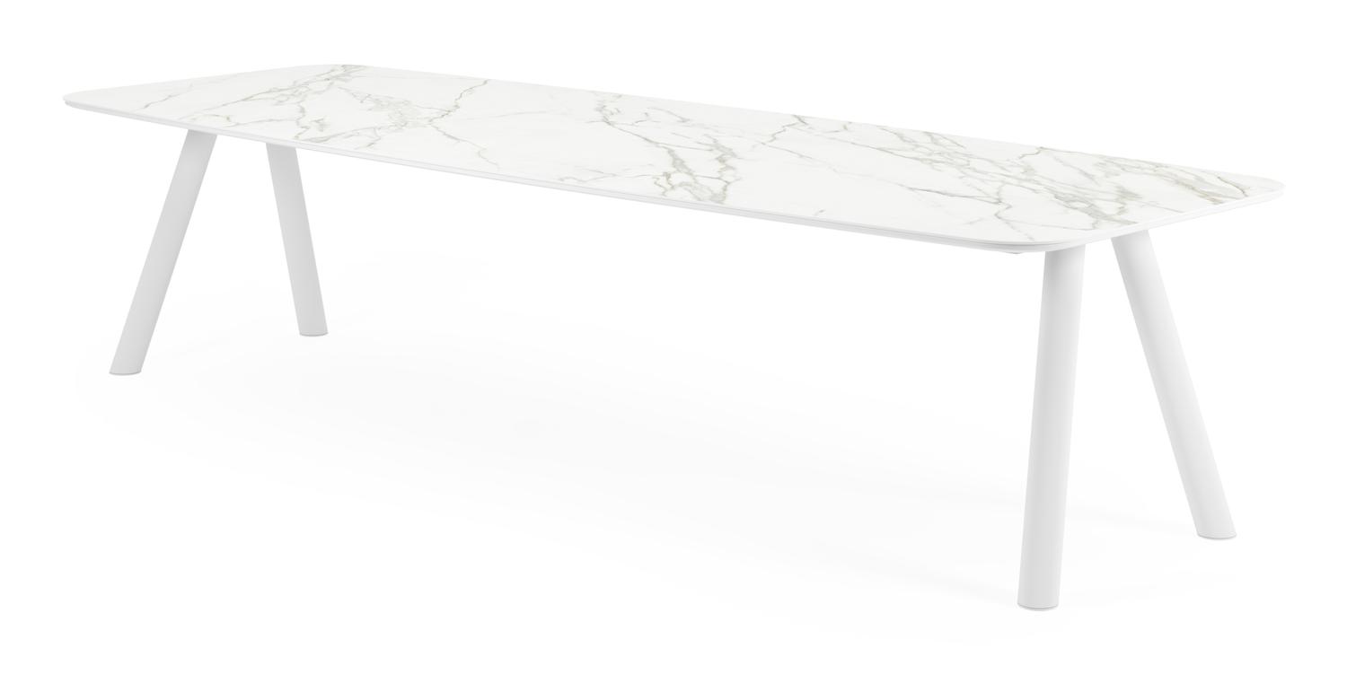 De Orso tuintafel bootvorm in wit aluminium en volkeramiek calacatta – L 315 x B 115 x H 73.5 cm is van het merk Bristolà la carte en is hier verkrijgbaar in de kleur wit.