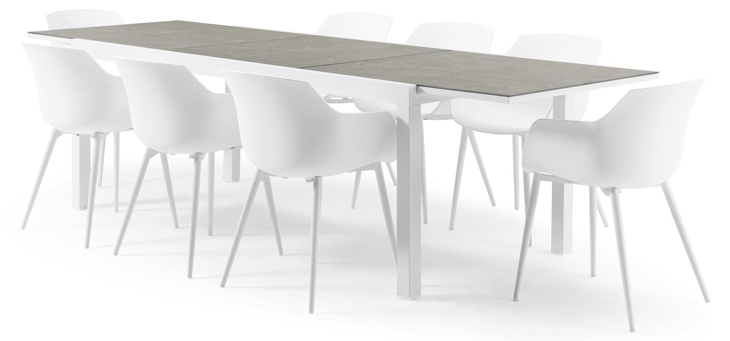 De Oviedo tuinset met verlengbare tafel in wit aluminium en grijs keramische print tafelblad met 8 Paco tuinstoelen is van het merk Vinci en is hier verkrijgbaar in de kleur grijs/wit.