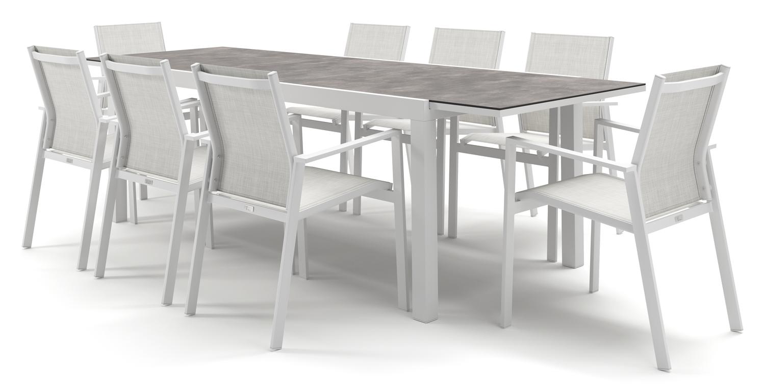 De Oviedo tuinset met verlengbare tafel in wit aluminium en grijs keramische print tafelblad met 8 stapelbare Bahia tuinstoelen is van het merk Vinci en is hier verkrijgbaar in de kleur grijs/wit.