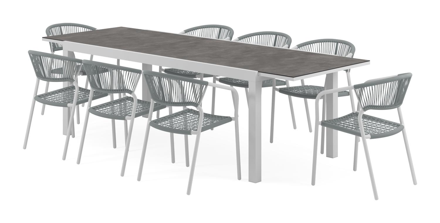 Oviedo tuinset met verlengbare tafel in wit aluminium en grijs keramische print tafelblad met 8 stapelbare Vigo tuinstoelen