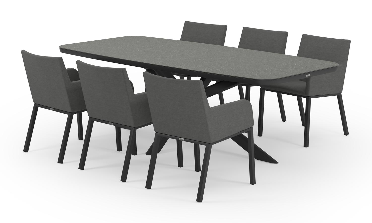 De Pamplona tuinset in zwart aluminium en grijs sintered stone tafelblad met 6 Rivo tuinstoelen is van het merk Bristol Essentials en is hier verkrijgbaar in de kleur zwart/grijs.