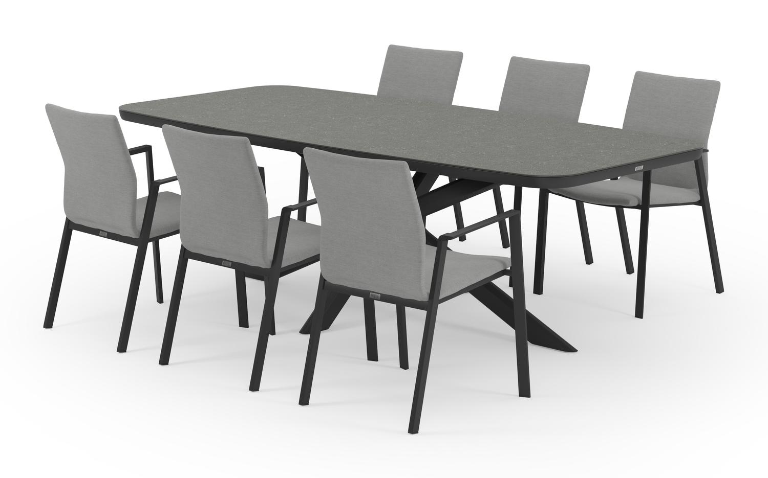 De Pamplona tuinset in zwart aluminium en grijs sintered stone tafelblad met 6 stapelbare Madura tuinstoelen is van het merk Bristol Essentials en is hier verkrijgbaar in de kleur zwart/grijs.