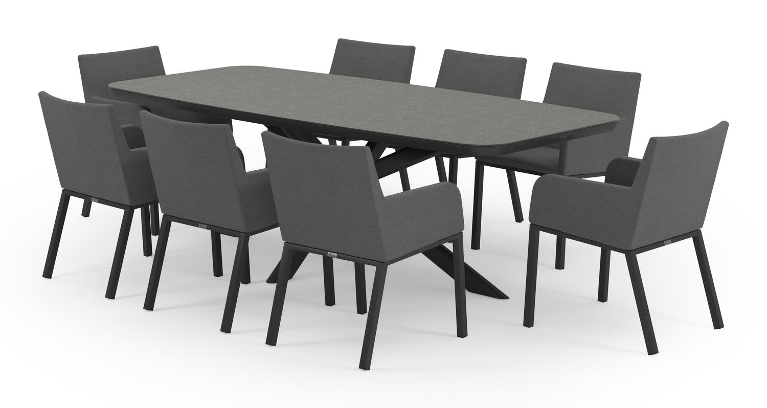 De Pamplona tuinset in zwart aluminium en grijs sintered stone tafelblad met 8 Rivo tuinstoelen is van het merk Bristol Essentials en is hier verkrijgbaar in de kleur zwart/grijs.