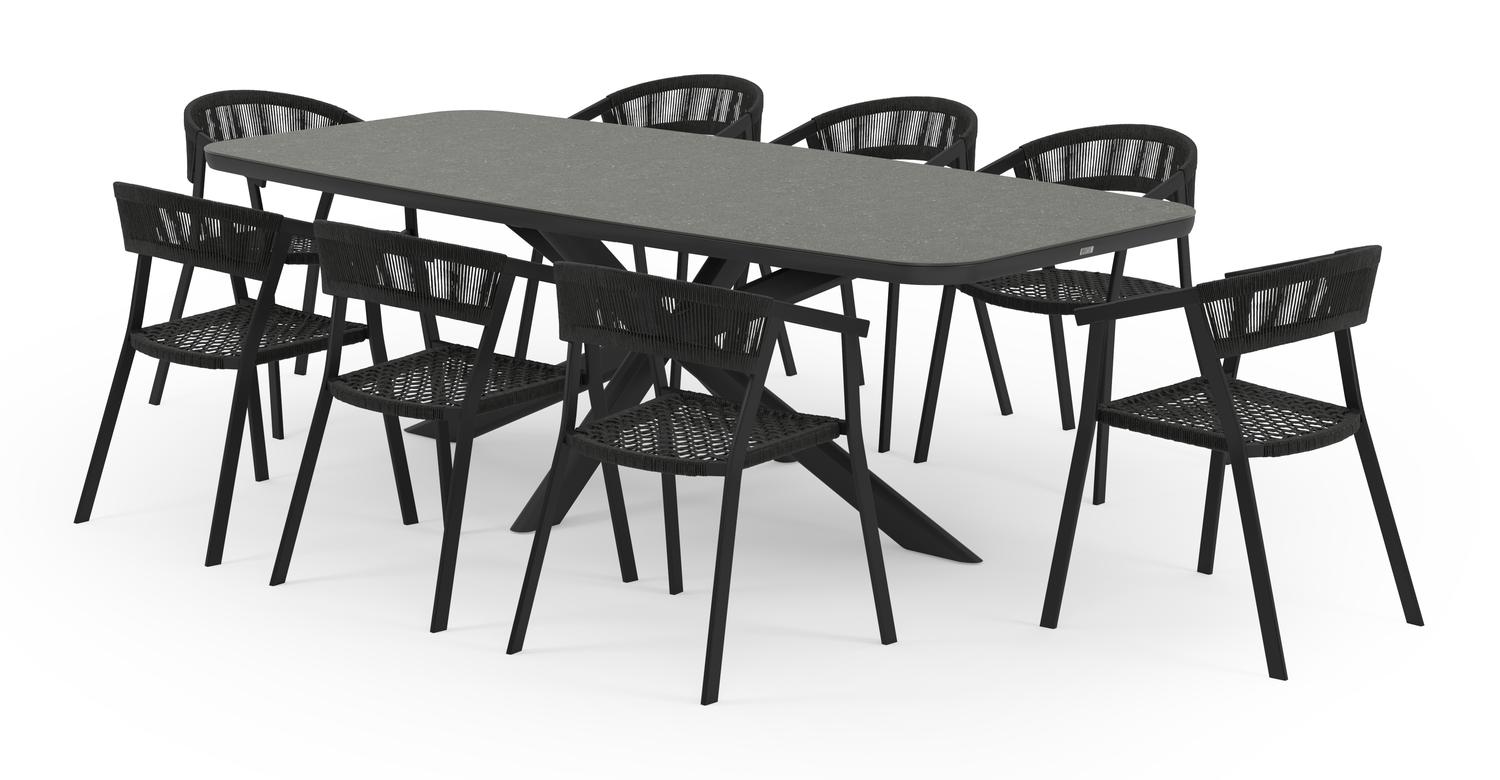 De Pamplona tuinset in zwart aluminium en grijs sintered stone tafelblad met 8 stapelbare Viaro tuinstoelen is van het merk Bristol Essentials en is hier verkrijgbaar in de kleur zwart/grijs.