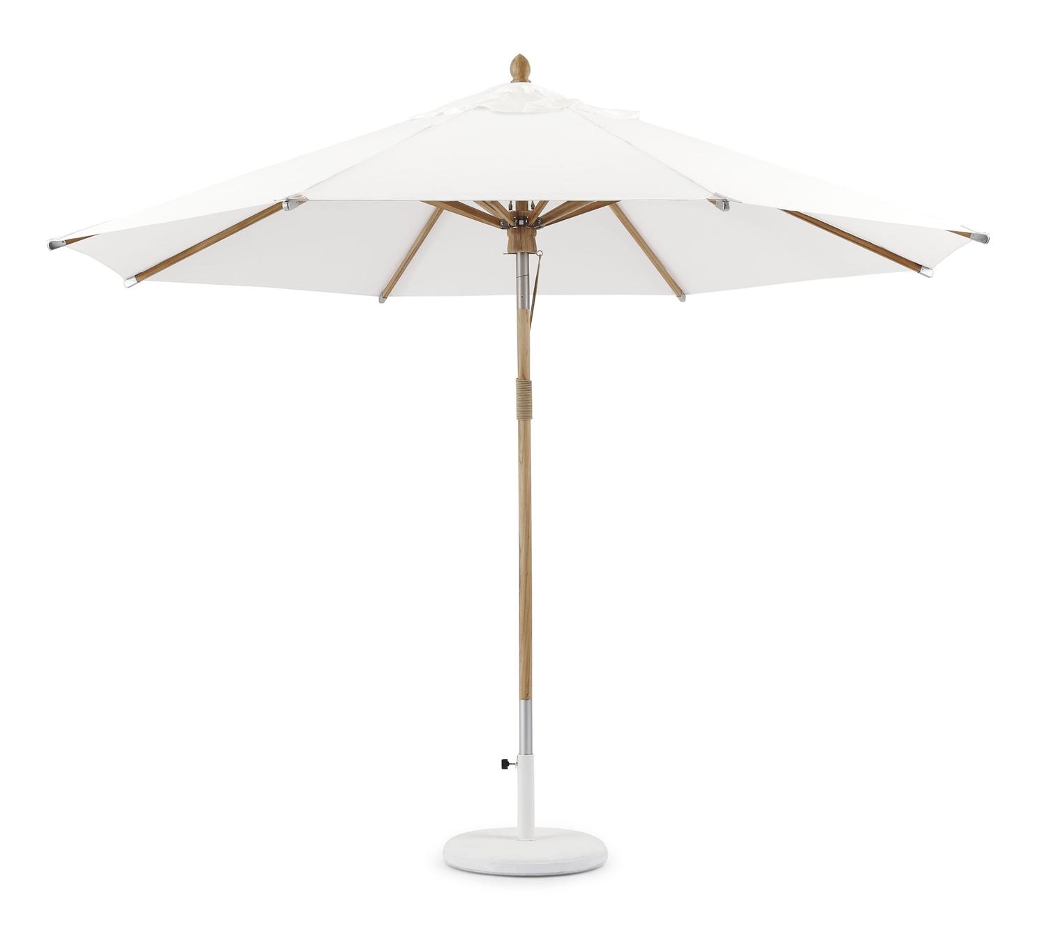 De Pescara staanparasol in teak met wit polyester parasoldoek – Dia 350 cm (met voet) is van het merk Bristolà la carte en is hier verkrijgbaar in de kleur naturel/wit.