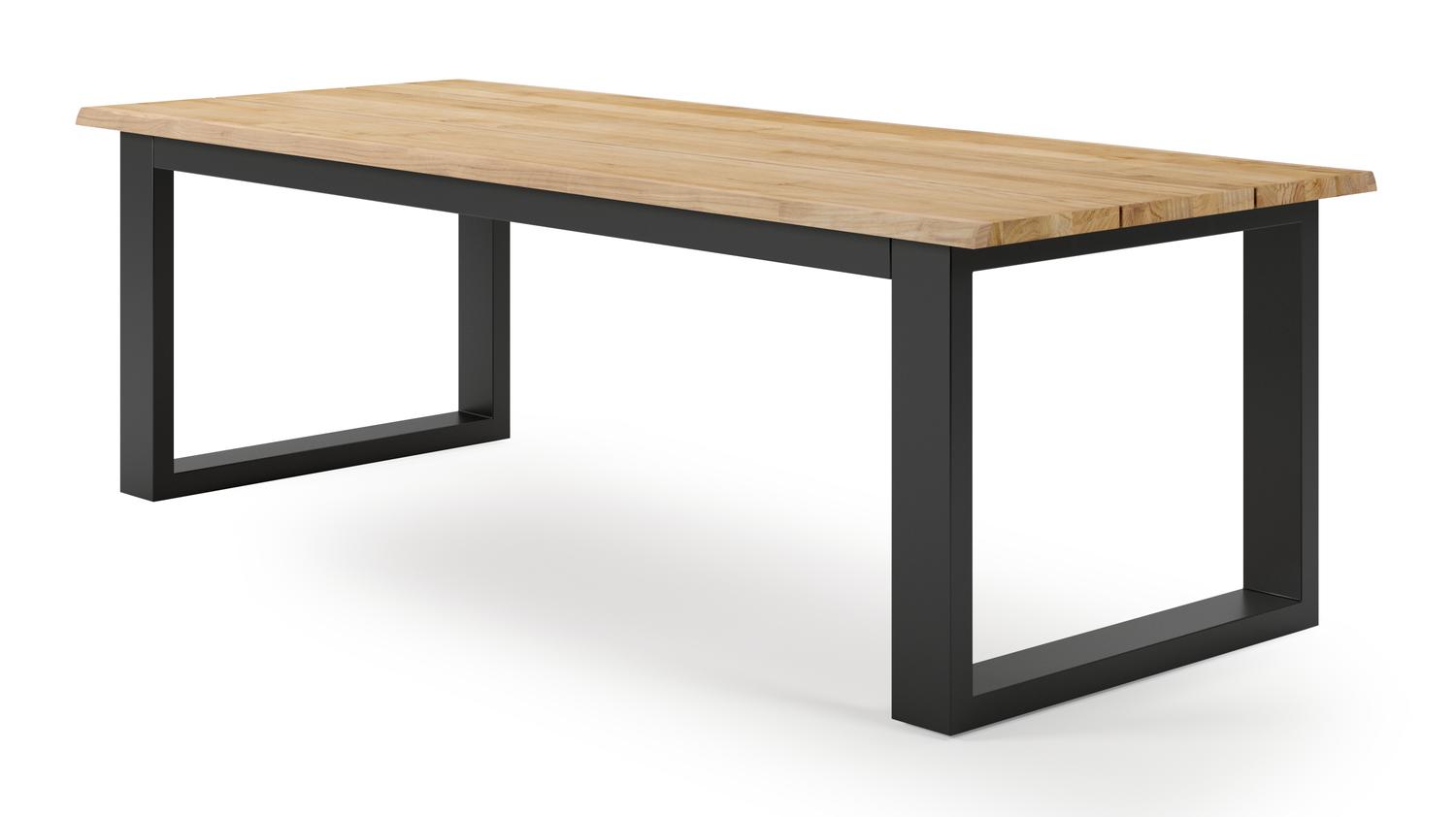 De Portorivo tafel heeft een strak, U-vormig onderstel. Het frame is gemaakt van aluminium een licht, maar sterk en roestvrij materiaal dat zeer geschikt is voor tuinmeubelen. Deze tafel is afgewerkt met een tafelblad in Live edge teak. Live edge bladen bestaan uit planken van teak-hout die komen uit de harde kern van de boom, aangevuld met een zachtere zijkant dat komt van het uiteinde van de stam. De vorm van de rand volgt dus de vorm van de boom. De schors wordt verwijderd en de zijkant wordt opgeschuurd. Hierdoor krijg je dus een grillige vorm, die bij elke blad uniek van vorm is.