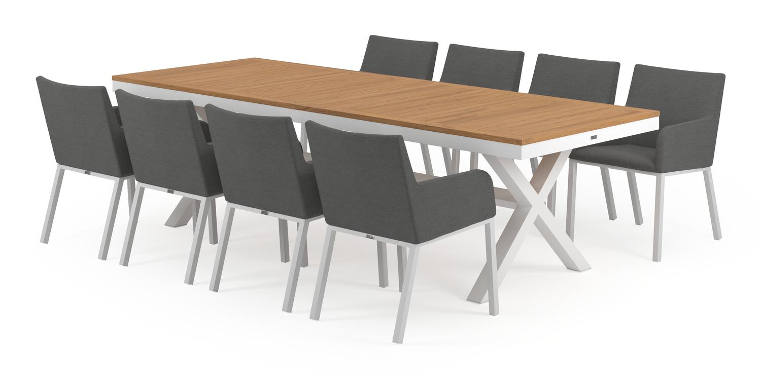 De Reza tuinset in wit aluminium en teak tafelblad met 8 Rivo tuinstoelen is van het merk Bristol Essentials en is hier verkrijgbaar in de kleur grijs/naturel/wit.
