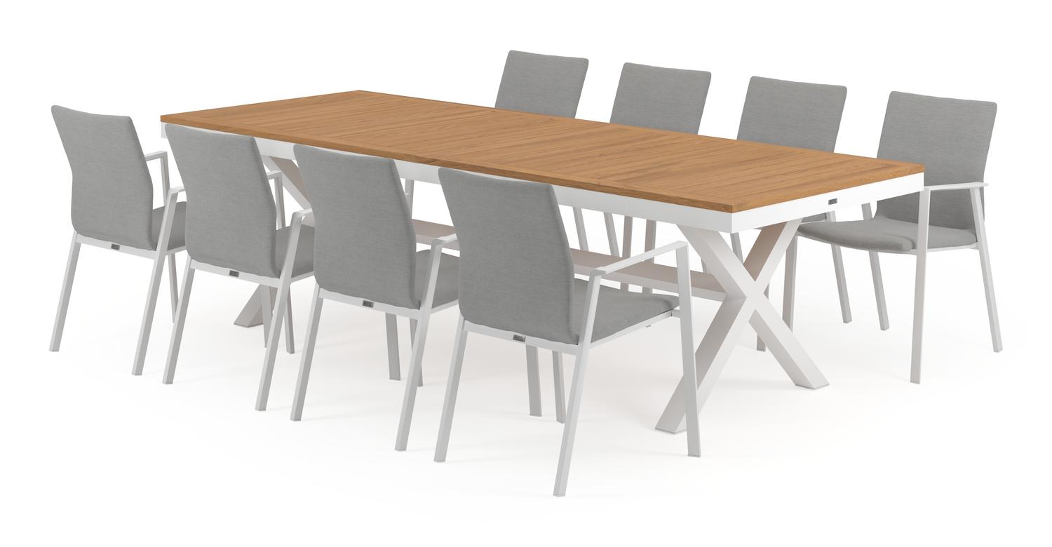 De Reza tuinset in wit aluminium en teak tafelblad met 8 stapelbare Madura tuinstoelen is van het merk Bristol Essentials en is hier verkrijgbaar in de kleur grijs/naturel/wit.