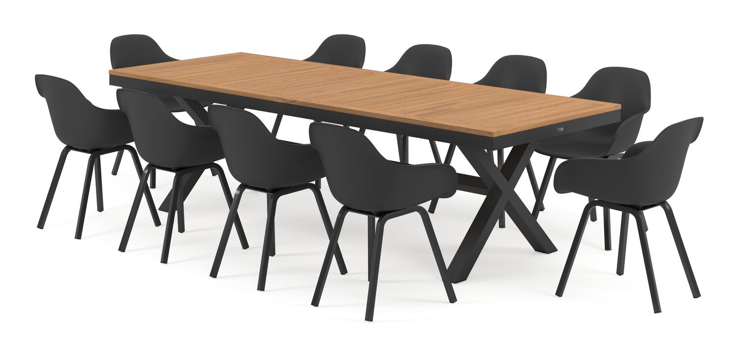 Reza tuinset in zwart aluminium en teak tafelblad met 10 Puglia tuinstoelen