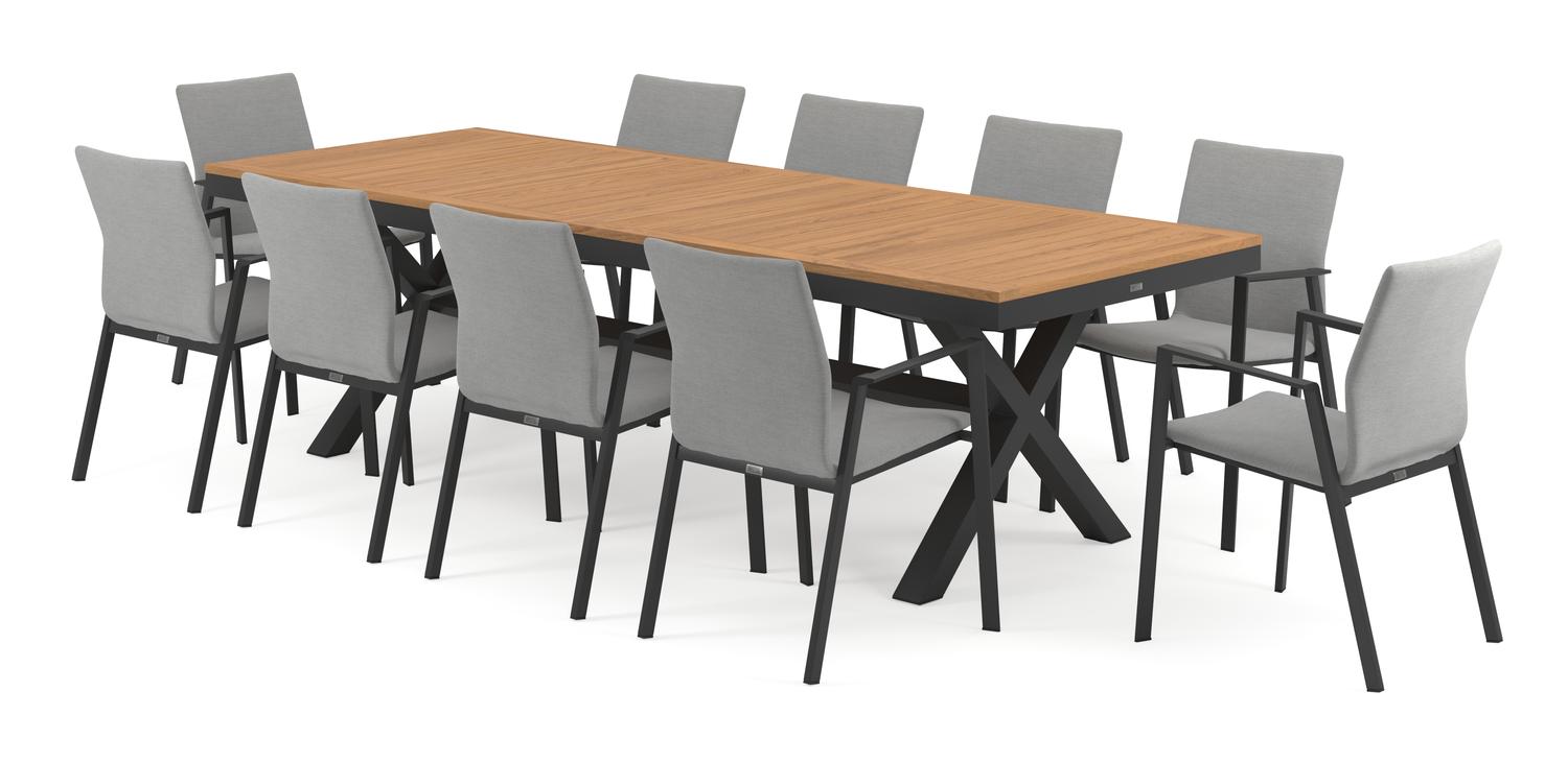 De Reza tuinset in zwart aluminium en teak tafelblad met 10 stapelbare Madura tuinstoelen is van het merk Bristol Essentials en is hier verkrijgbaar in de kleur zwart/grijs/naturel.