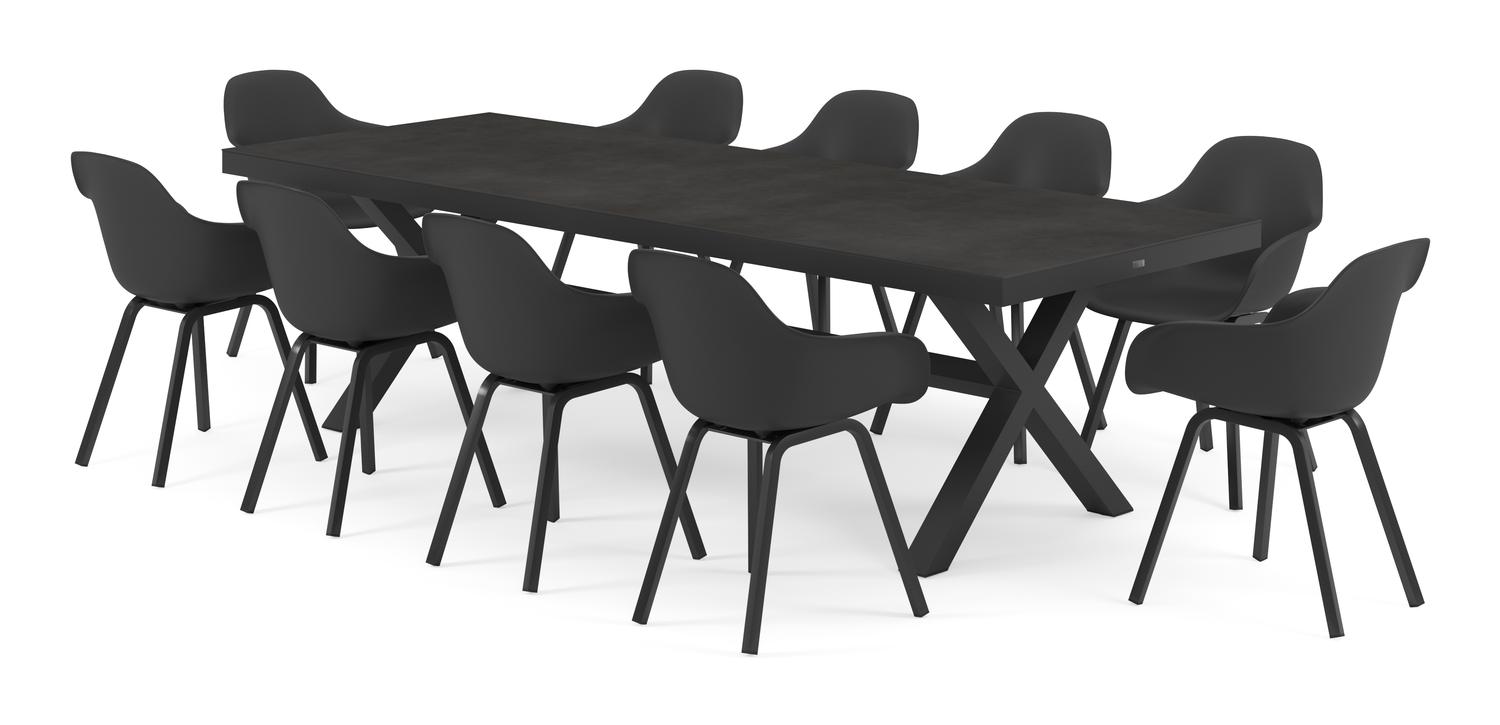 De Reza tuinset in zwart aluminium en zwart volkeramiek tafelblad met 10 Puglia tuinstoelen is van het merk Bristol Essentials en is hier verkrijgbaar in de kleur zwart.