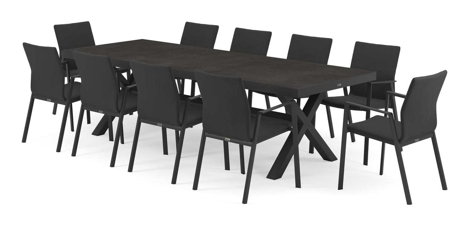 De Reza tuinset in zwart aluminium en zwart volkeramiek tafelblad met 10 stapelbare Madura tuinstoelen is van het merk Bristol Essentials en is hier verkrijgbaar in de kleur zwart.