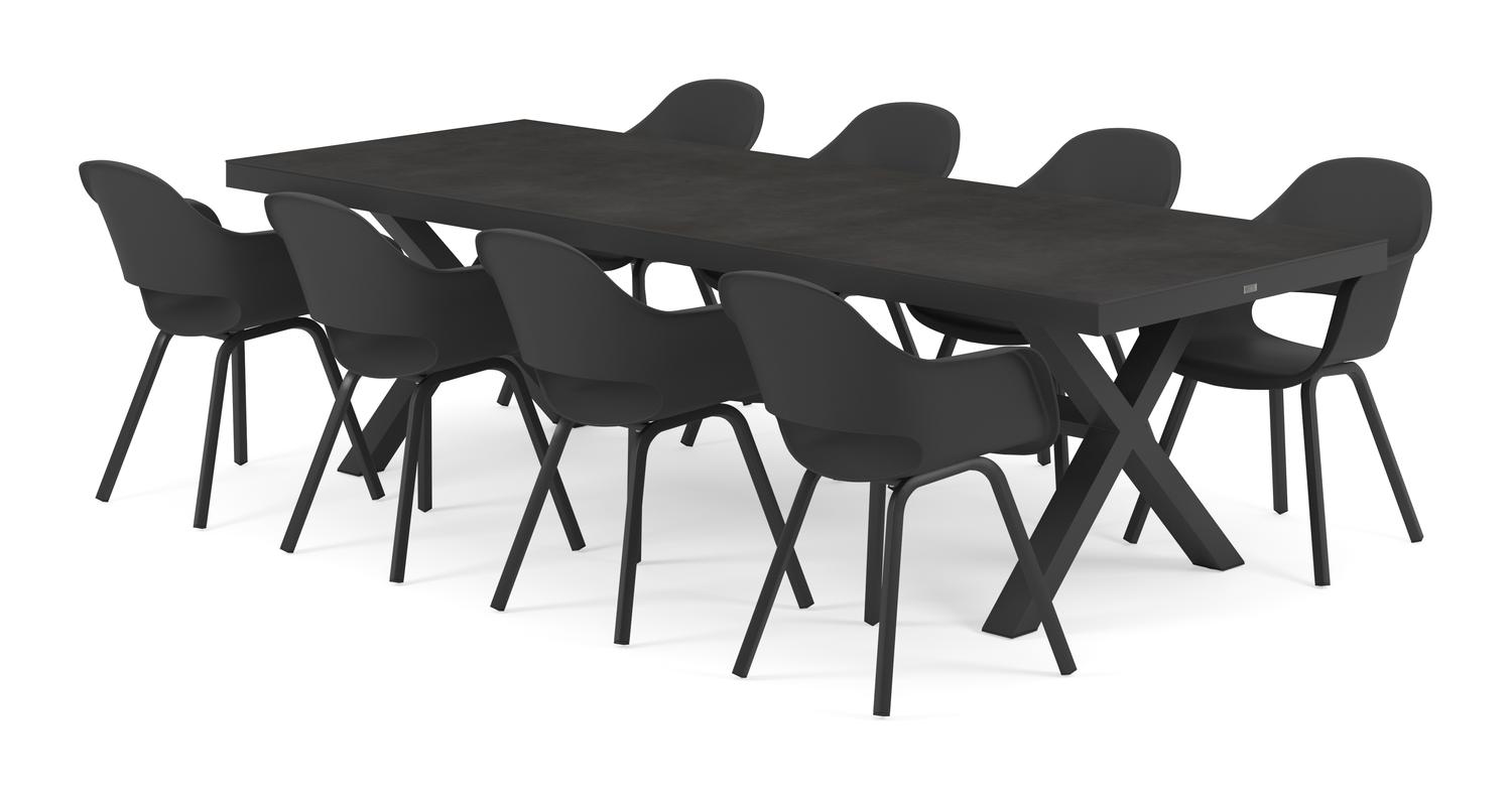 Reza tuinset in zwart aluminium en zwart volkeramiek tafelblad met 8 Artena tuinstoelen