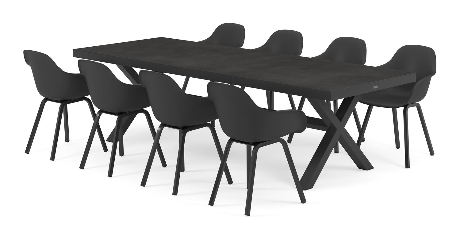 De Reza tuinset in zwart aluminium en zwart volkeramiek tafelblad met 8 Puglia tuinstoelen is van het merk Bristol Essentials en is hier verkrijgbaar in de kleur zwart.