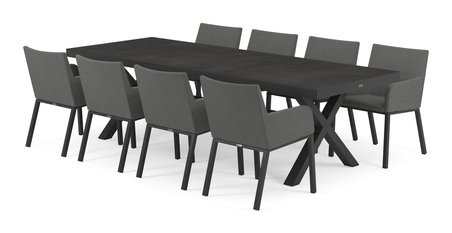 De Reza tuinset in zwart aluminium en zwart volkeramiek tafelblad met 8 Rivo tuinstoelen is van het merk Bristol Essentials en is hier verkrijgbaar in de kleur zwart/grijs.