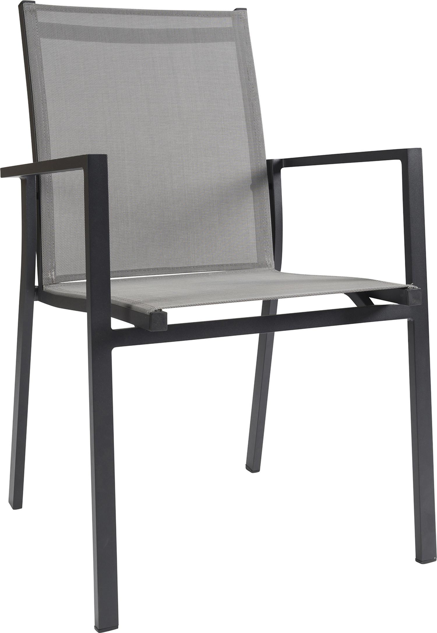 De Rimini stapelbare tuinstoel in zwart aluminium en grijs textilene is van het merk Bristolà la carte en is hier verkrijgbaar in de kleur zwart/grijs.