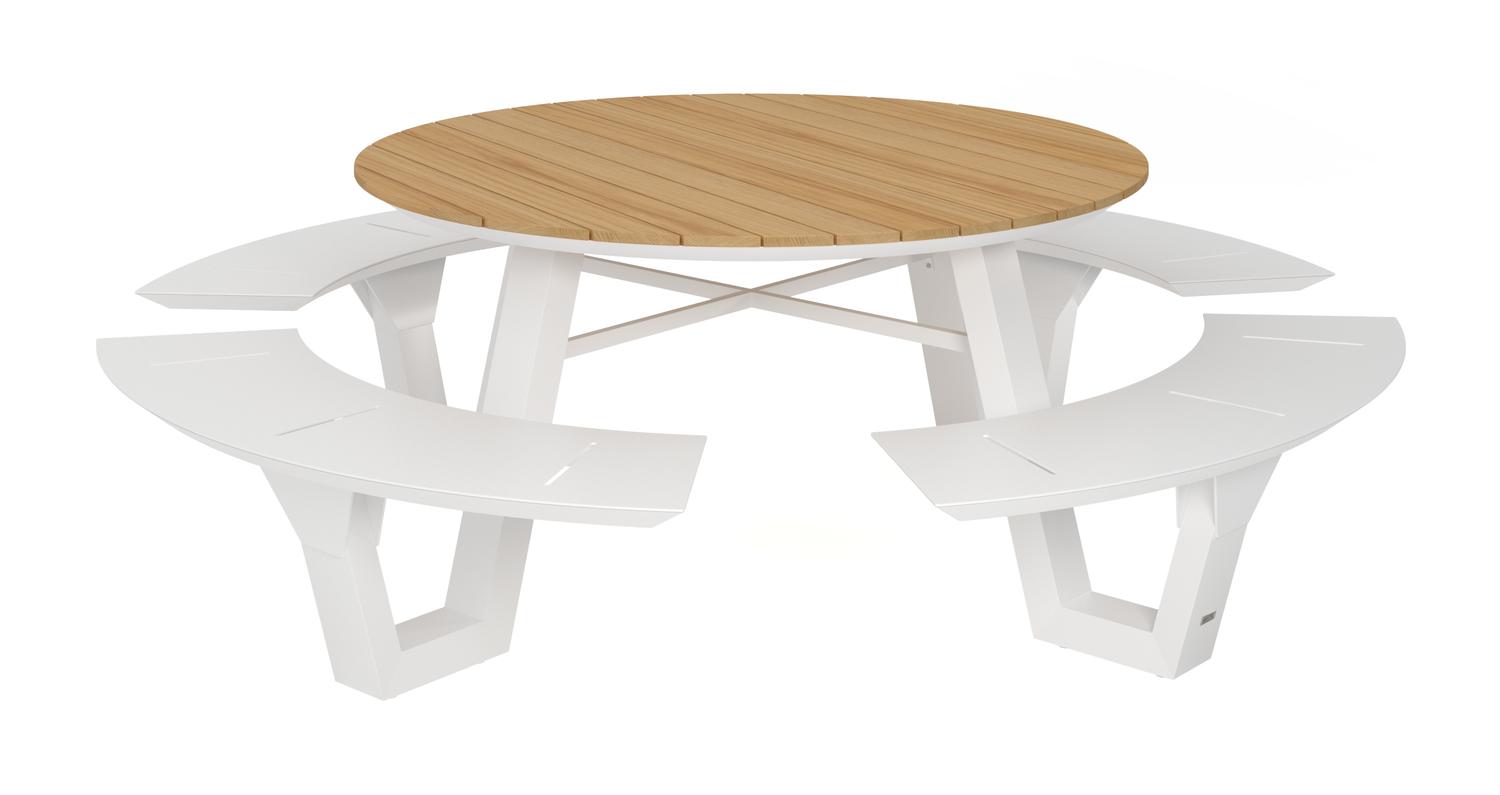 De Rondino picknicktafel in wit aluminium en teak tafelblad – Dia. 236 x H 71,5 cm is van het merk Bristolà la carte en is hier verkrijgbaar in de kleur wit.