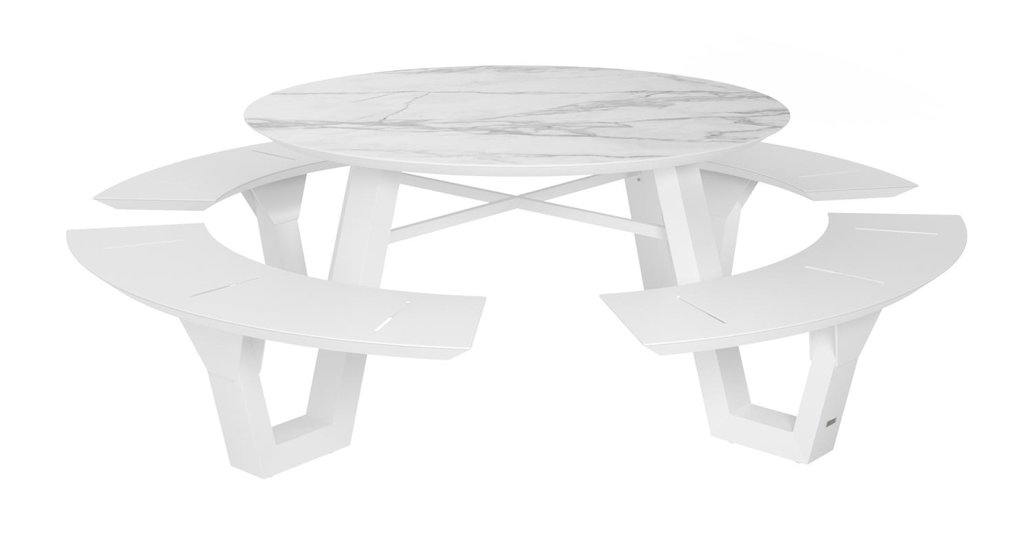 De Rondino picknicktafel in wit aluminium en volkeramiek calacatta tafelblad – Dia. 236 x H 71,5 cm is van het merk Bristolà la carte en is hier verkrijgbaar in de kleur wit.