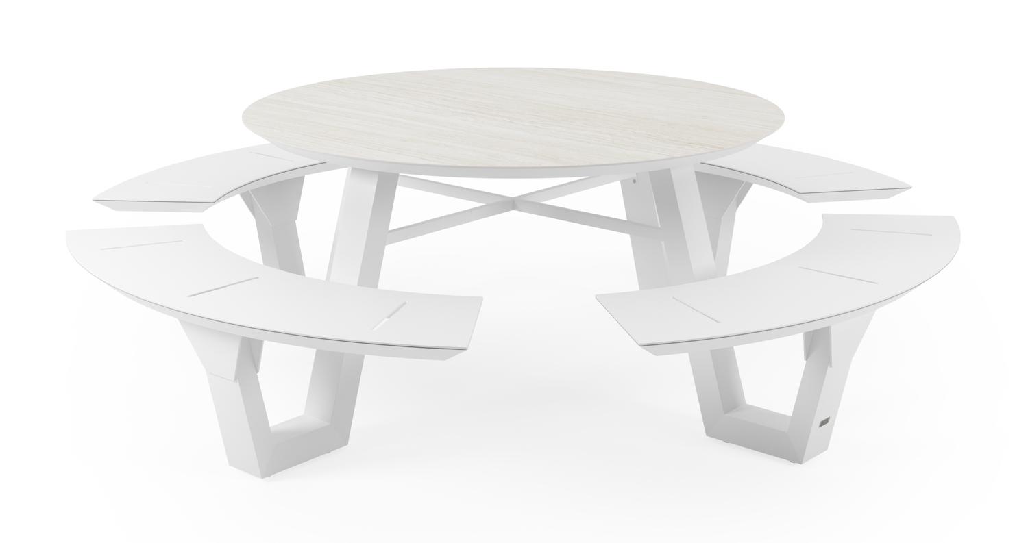 De Rondino picknicktafel in wit aluminium en volkeramiek calista tafelblad – Dia. 236 x H 71,5 cm is van het merk Bristolà la carte en is hier verkrijgbaar in de kleur wit/beige.