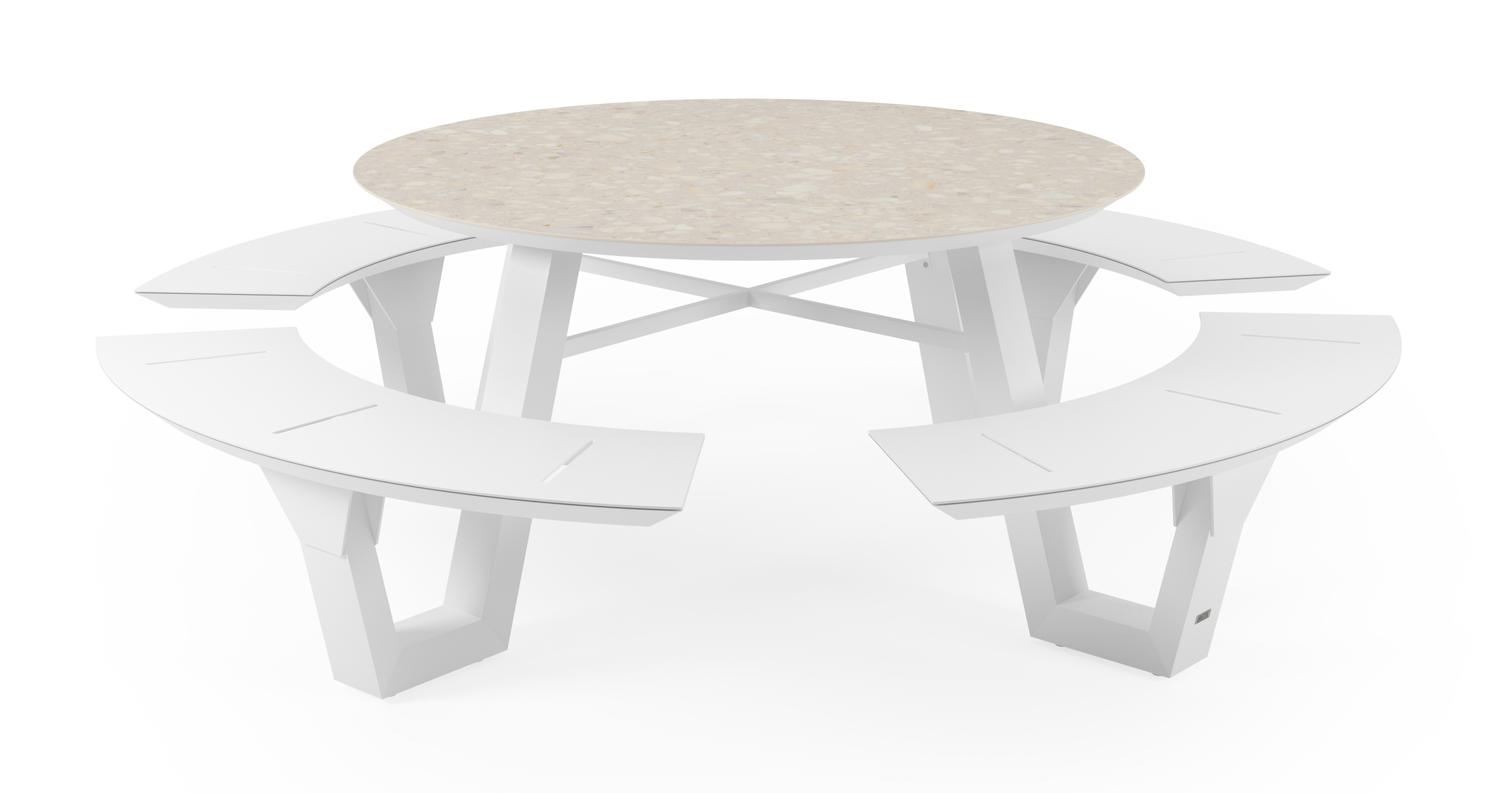 De Rondino picknicktafel in wit aluminium en volkeramiek retrostone tafelblad – Dia. 236 x H 71,5 cm is van het merk Bristolà la carte en is hier verkrijgbaar in de kleur wit/beige.