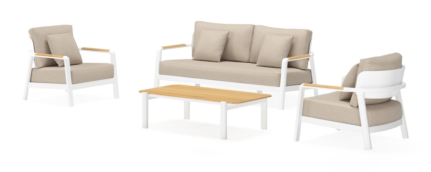 Productomschrijving Salamanca loungeset in wit aluminium en teak met desert weather+ softtouch kussens en loungetafel
