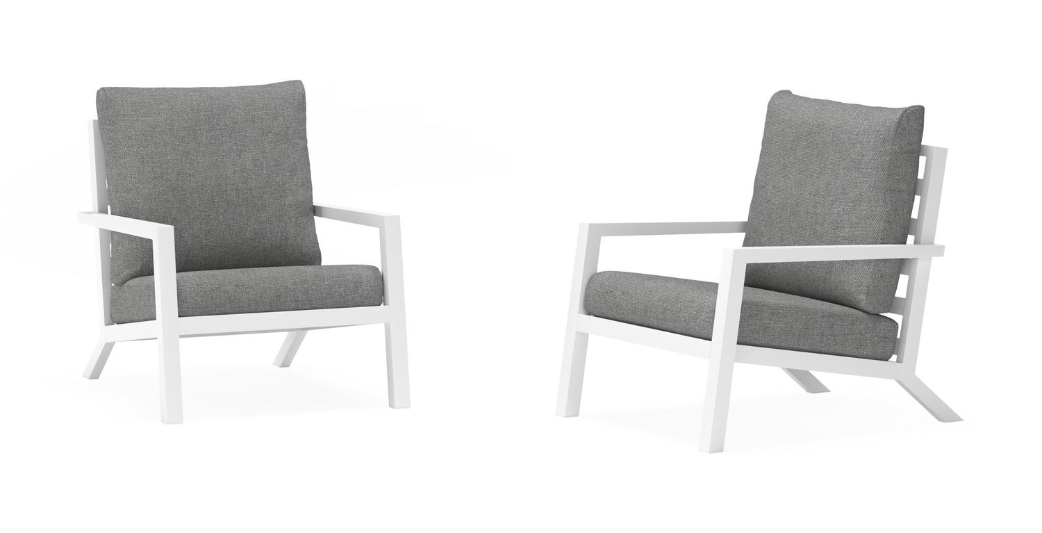 De Set van 2 Alcudia loungestoelen in wit aluminium met grijs polyester kussens is van het merk Vinci en is hier verkrijgbaar in de kleur wit/grijs.