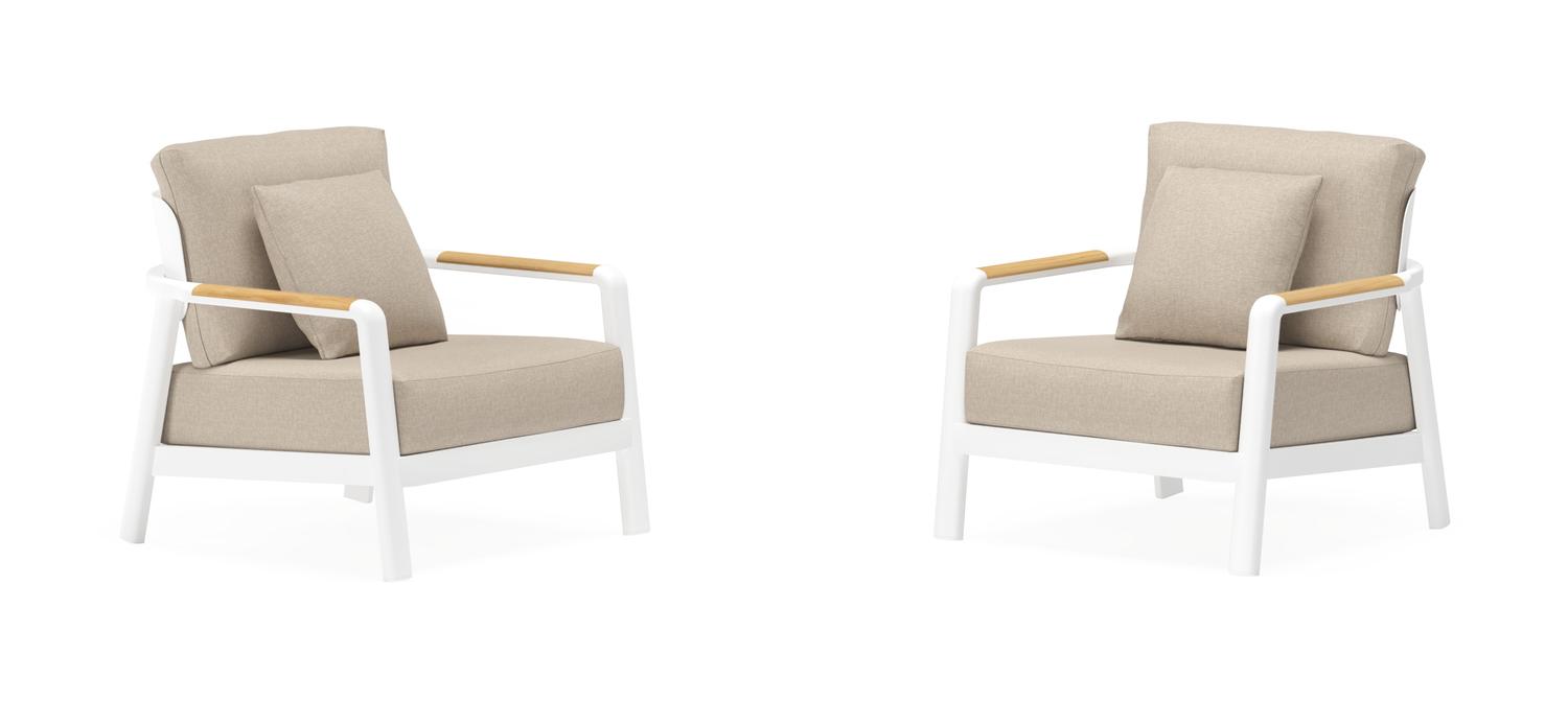 De Set van 2 Salamanca loungestoelen 2 x 1-zit in wit aluminium en teak met desert weather+ softtouch kussen is van het merk Bristol Essentials en is hier verkrijgbaar in de kleur wit/beige.