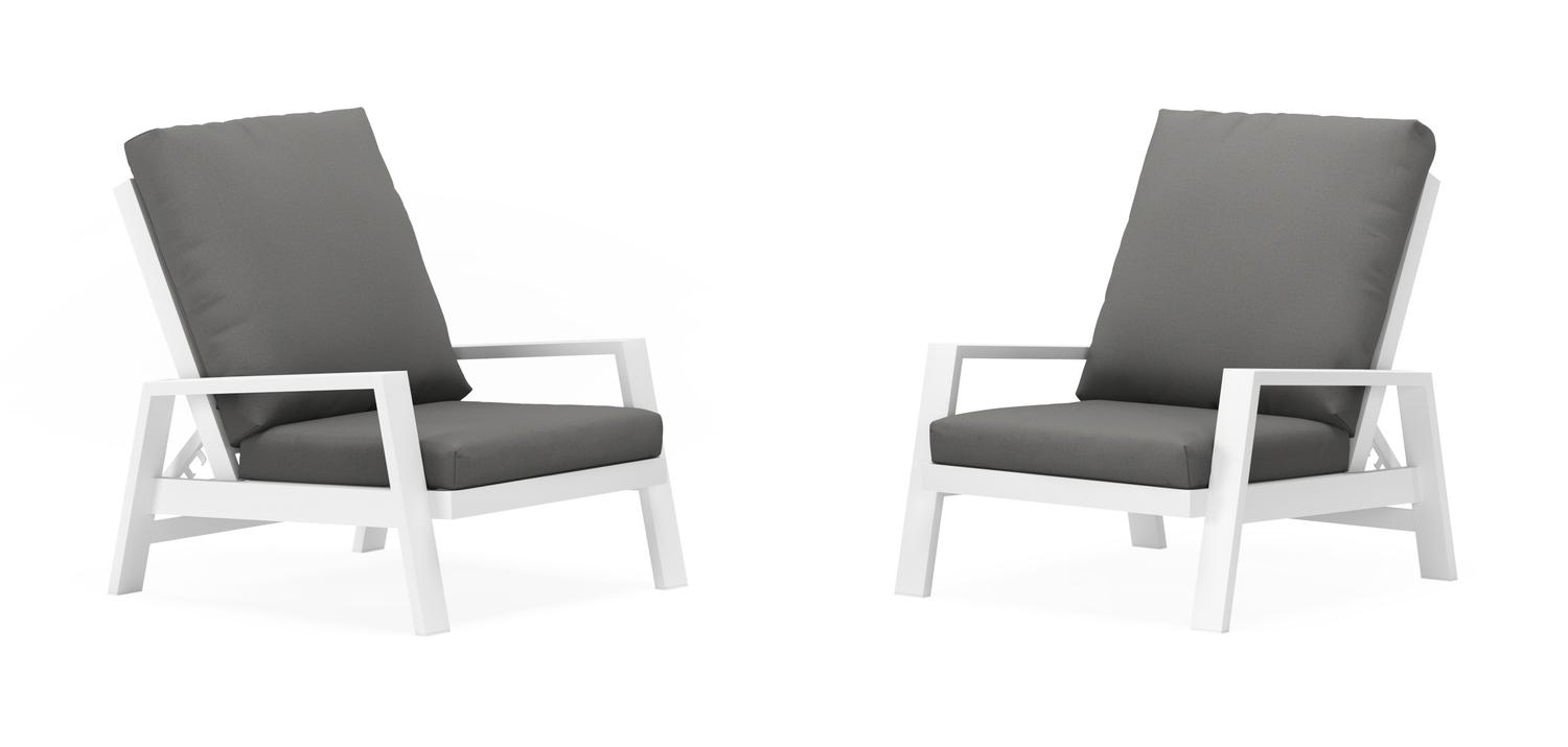 De Set van 2 Veneto loungestoelen 2 x 1-zit in wit aluminium met grijs weather+ softtouch kussen is van het merk Bristol Essentials en is hier verkrijgbaar in de kleur wit/grijs.