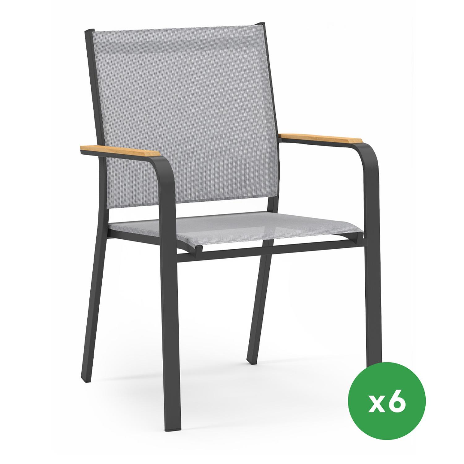 De Set van 6 Amalfi stapelbare tuinstoelen in zwart aluminium en textilene en teak armleuning is van het merk Bristol Essentials en is hier verkrijgbaar in de kleur zwart/grijs.