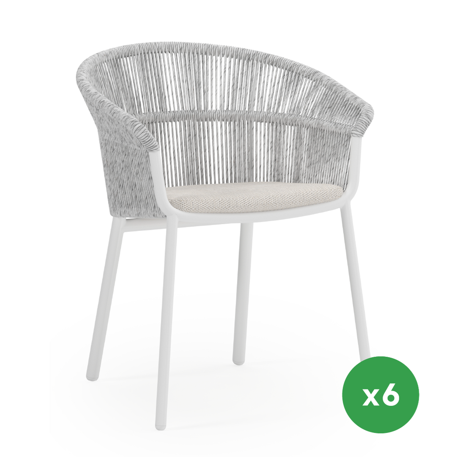 De Set van 6 Matera stapelbare tuinstoelen in wit aluminium en gedraaide ronde wicker met kussen in sand weather+ softtouch is van het merk Bristol Essentials en is hier verkrijgbaar in de kleur wit/beige.