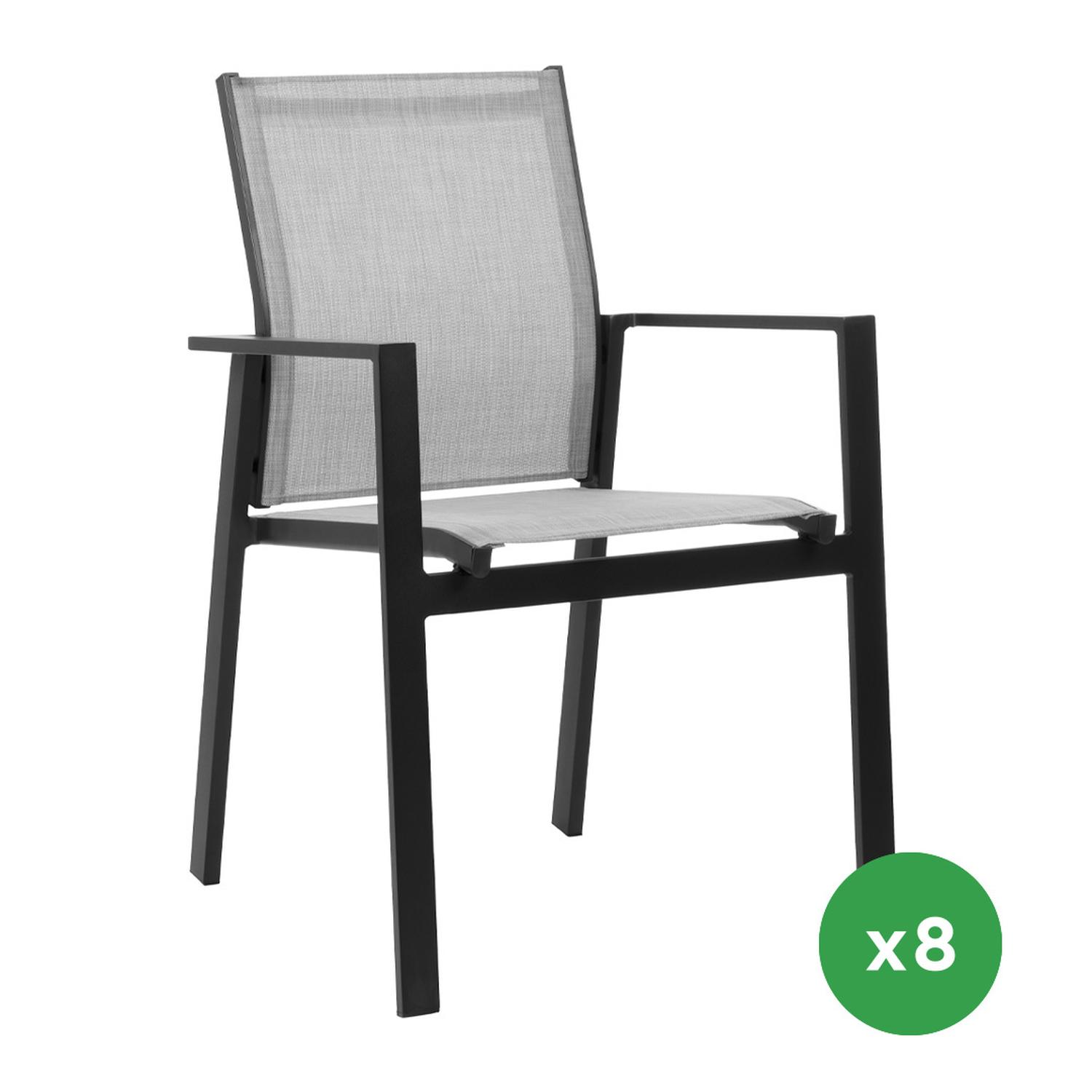 De Set van 8 Bahia stapelbare tuinstoelen in zwart aluminium en textilene is van het merk Vinci en is hier verkrijgbaar in de kleur zwart/grijs.