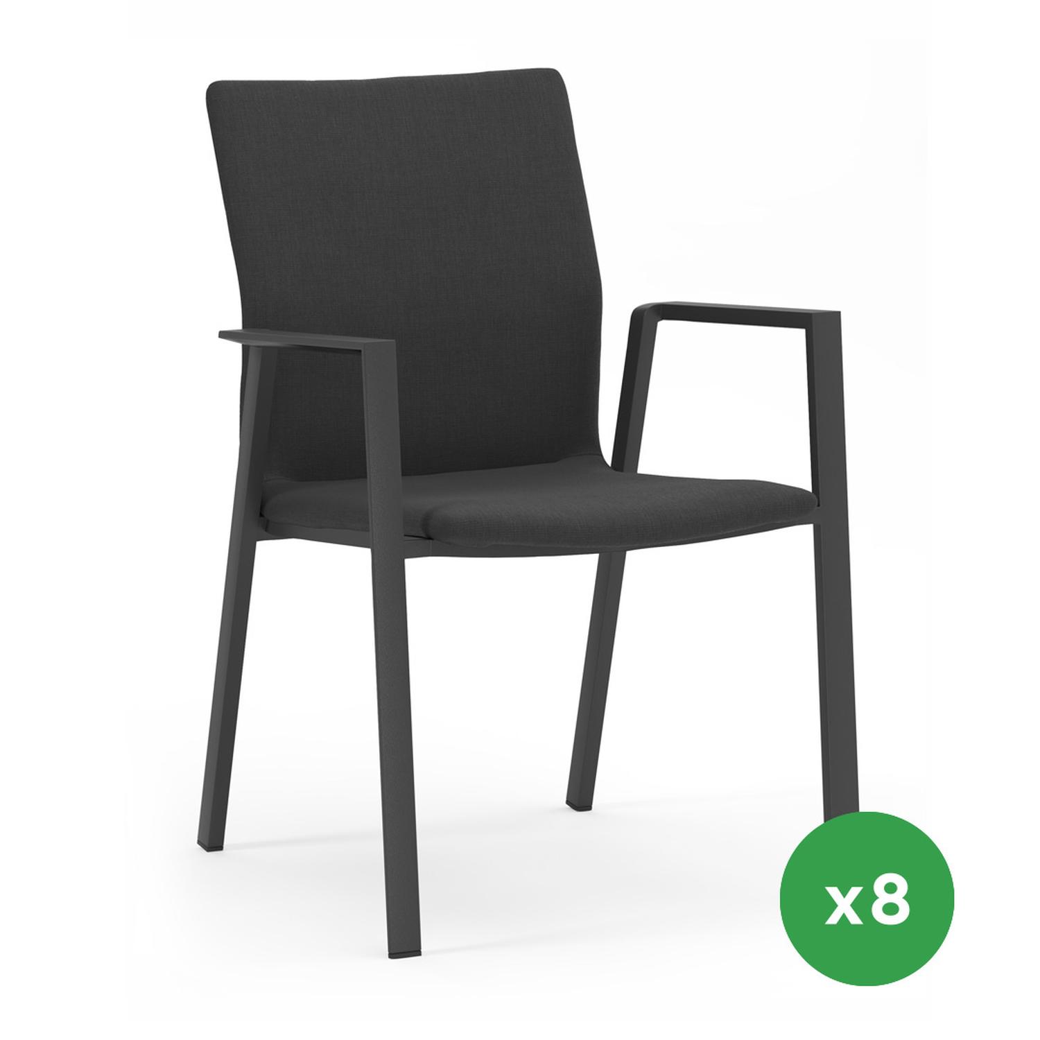 De Set van 8 Madura stapelbare tuinstoelen in zwart aluminium en dubbele luxe textilene is van het merk Bristol Essentials en is hier verkrijgbaar in de kleur zwart.