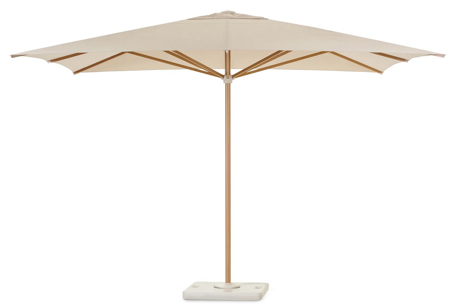 De Solino staanparasol in houtlook met beige all weather sunbrella® premium parasoldoek – Dia 400 cm (met voet) is van het merk Bristolà la carte en is hier verkrijgbaar in de kleur beige/bruin.
