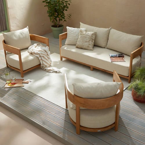 De Redondo loungeset bestaat uit een loungebank en twee royale loungestoelen. Dankzij de drie losse elementen kun je altijd een geschikte opstelling maken die perfect past bij jouw tuin of terras. Uniek aan de Redondo loungeset is de prachtig afgeronde rugleuning die doorloopt in de armleuning. Dankzij de dikke zit- en rugkussens ervaar je een ultiem zitcomfort. De ronde vorm en chubby kussens passen helemaal bij de tuintrends van 2024. Met deze set uit de Studio LIVIT collectie kun je gegarandeerd de hele zomer genieten.Bekijk ook eens de bijpassende salontafel. Zo maak je de set helemaal compleet!Afmetingen (bank en stoelen)Breedte: 180 cmDiepte:: 80 cmHoogte: 62 cmZithoogte: 32 cmZitdiepte: 77 cmBreedte: 80 cmDiepte: 80 cmHoogte: 62 cmZithoogte: 32 cmZitdiepte: 77 cmMateriaal en onderhoudDit meubel is vervaardigd uit teakhout. Het materiaal is uitermate geschikt voor tuinmeubelen. Het is zeer sterk en kan goed tegen een stootje. Ook is teakhout weersbestendig. Een regenbuitje is dus helemaal niet erg! Toch raden we je aan om het meubel na het zomerseizoen binnen op te bergen of af te dekken met een geschikte meubelhoes. Zo kun je gegarandeerd jarenlang genieten van tuinmeubel. Goed onderhoud van natuurlijke materialen is essentieel. Was je teakhouten tuinmeubel één keer in het jaar met groene zeep en behandel met een finisher of hardhout olie. Dit voorkomt veroudering van het hout en beschermt tegen zon en vervuiling.Studio LIVITWelkom thuis bij Studio LIVIT. Wij zijn hét merk voor hoogwaardige meubels en accessoires die iedere ruimte in én buitenshuis karakter geven. Ontdek een collectie zorgvuldig ontworpen door vakmensen van eigen bodem. Studio LIVIT staat voor stijlvolle elegantie en Nederlands design. Van de woonkamer tot de slaapkamer, en zelfs met onze tuincollectie, brengen wij functionaliteit en esthetiek samen. Woonplezier bestaat voor ons uit zorgeloos genieten in een ruimte die bij je past. Daarom creëren we meubels waar je echt op kunt bouwen en langdurig plezier van hebt. Welkom thuis bij Studio LIVIT, waar jouw stijl tot leven komt.GarantieOp alle tuinmeubelen van Studio LIVIT geven wij 2 jaar garantie. Naast de Wehkamp garantie geldt de wettelijke garantie.