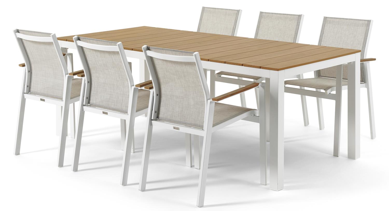 De Toma tuinset in wit aluminium en polywood tafelblad met 6 stapelbare Bahia tuinstoelen is van het merk Vinci en is hier verkrijgbaar in de kleur grijs/naturel/wit.