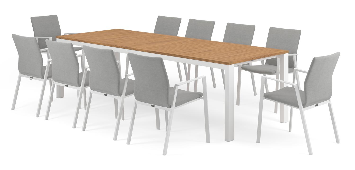 De Trente tuinset in wit aluminium en teak tafelblad met 10 stapelbare Madura tuinstoelen is van het merk Bristol Essentials en is hier verkrijgbaar in de kleur wit/naturel/grijs.