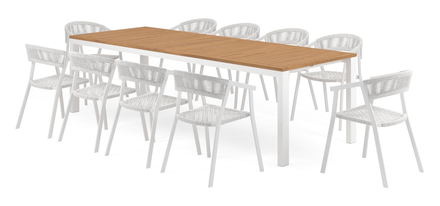 De Trente tuinset in wit aluminium en teak tafelblad met 10 stapelbare Viaro tuinstoelen is van het merk Bristol Essentials en is hier verkrijgbaar in de kleur naturel/wit.