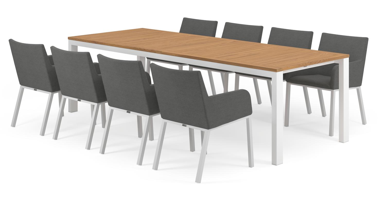 De Trente tuinset in wit aluminium en teak tafelblad met 8 Rivo tuinstoelen is van het merk Bristol Essentials en is hier verkrijgbaar in de kleur wit/naturel/grijs.