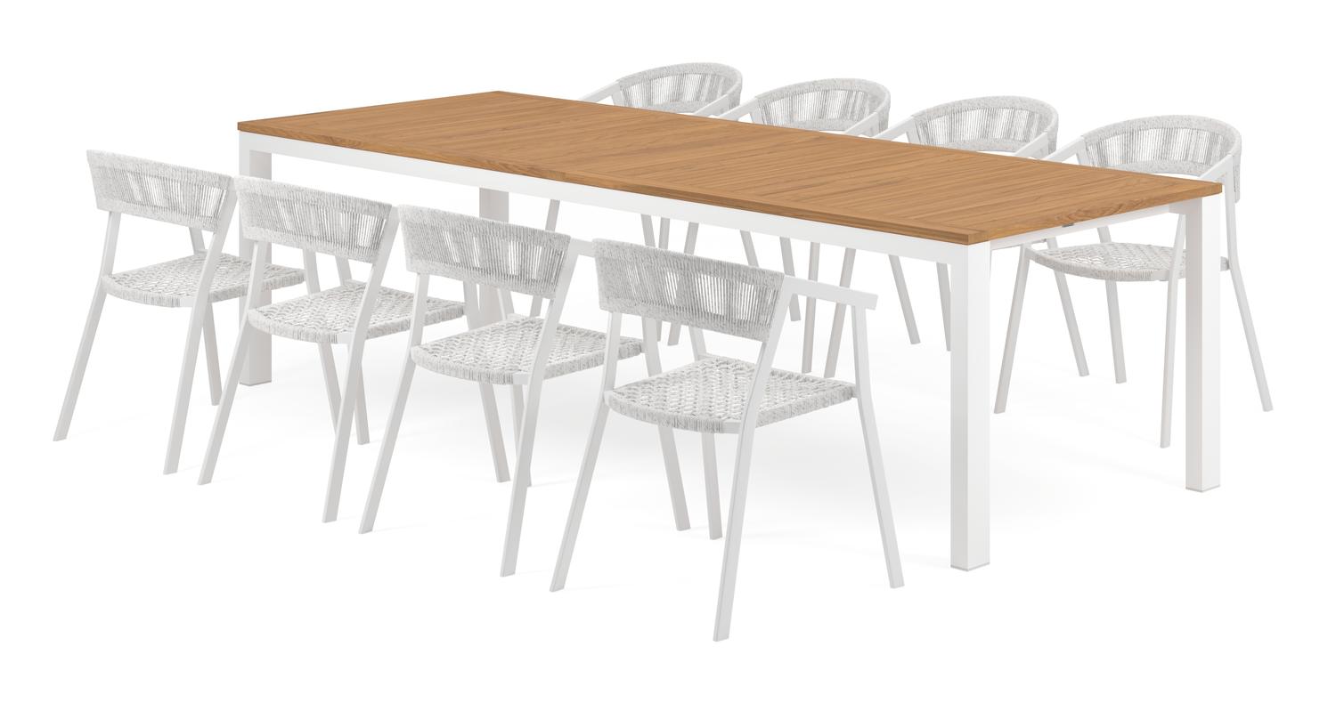 De Trente tuinset in wit aluminium en teak tafelblad met 8 stapelbare Viaro tuinstoelen is van het merk Bristol Essentials en is hier verkrijgbaar in de kleur naturel/wit.
