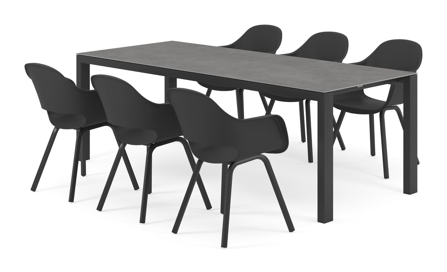 De Trente tuinset in zwart aluminium en grijs volkeramiek tafelblad met 6 Artena tuinstoelen is van het merk Bristol Essentials en is hier verkrijgbaar in de kleur zwart/grijs.