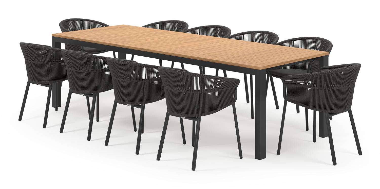 De Trente tuinset in zwart aluminium en natural finish teak tafelblad met 10 stapelbare Matera tuinstoelen is van het merk Bristol Essentials en is hier verkrijgbaar in de kleur zwart/naturel.